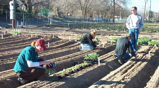 The OASIS fields, New Mexico State, in spring 2003. Students (left to right) are Ben Prihoda, majoring in Hotel, Restaurant, and Tourism Management; Dayna Drollinger, majoring in Horticulture; and Joaquin Gallegos, majoring in Anthropology. Standing is OASIS co-instructor and associate professor in Horticulture Chistopher S. Cramer, (photo courtesy of Connie Falk).