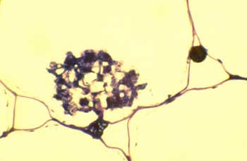 The most important symbiosis between plants and fungi is the mycorrhiza, literally translated as a “fungus-root.” There are several types of mycorrhizas, but the most important in agriculture and horticulture are the endomycorrhizae, or arbuscular mycorrhizae. Arbuscular mycorrhizal [AM] fungi are native to most soils, and are so called because they produce microscopic tree-like structures (“arbuscules”) within cells of the root. (See photo.)