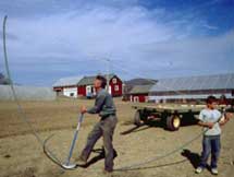 This design uses twenty-five 3/4-inch galvanized water pipes that are 21 feet long. These are available from any plumbing supply facility and cost about $23 each in our area. We bend the pipes ourselves into a half-circle using a jig with about twenty short pieces of 2 x 4-inch boards (about 8 to 10-feet long). The boards are each attached with 2 screws onto our hay wagon about one foot apart. The one end of the pipe is attached to the wagon with 2 boards, then one person merely ?walks? the pipe around the jig until it touches the last small board. Next, using a pipe bender, we bend the peak to be gothic style, bending until an attached string shows the ends are 14 feet apart. Finally, a slight bend is put six inches from the end of each pipe, so the hoop drops into the fence pipes easily.