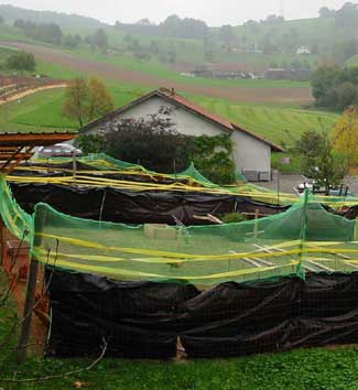 Researchers from FiBL conduct many on-farm research projects at numerous locations. We visited the Dieter Weber farm. Mr. Weber raises produce for a roadside market and has a pick-your-own flower operation. He also raises 2000 laying hens. The flock averages 96% productivity with less than 2% mortality.