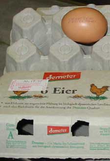 The egg at left was laid in Freiland, Germany, not on the Dieter Weber farm. It was certified biodynamic by Demeter. Note the conspicuous display of the Demeter logo on the egg carton. Many products in Europe prominently display the name and logo of the certification body similar to a “brand” identity. Note also that the carton carries the “best buy” date for the eggs and the carton is designed to be easily sold in half dozen units.