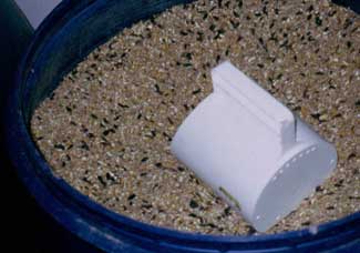The scratch feed used once a day to lure the birds back into the winter garden consists of whole small grains (wheat, oats, and barley), cracked corn, and sunflower seeds.