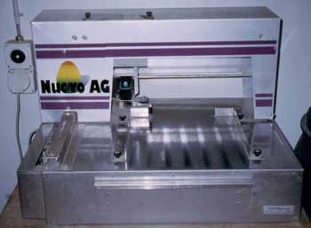 Throughout Europe, eggs are stamped when they are packed. The machine at right stamps a flat of eggs. Each egg shows the name of the farm, region produced, date, and/or organic certification.