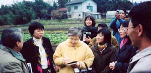 町田氏(写真右端)の農場で、消費者グループがロデール研究所からの訪問者に会っているところ。左から2番目は堂前恵子さん。地域支援型農業(CSA)の活動を推し進め、秀明自然農法ネットワークに加入している農家を助けてきました。 |